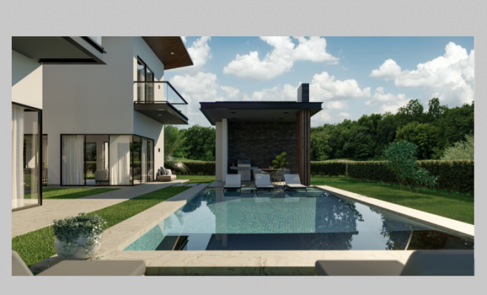 La villa tiene 492 m2 de Construcción, 95 m2 de terraza y marquesina y una piscina de 54,8 m2. El total del área de lote es de 1,020 m2.