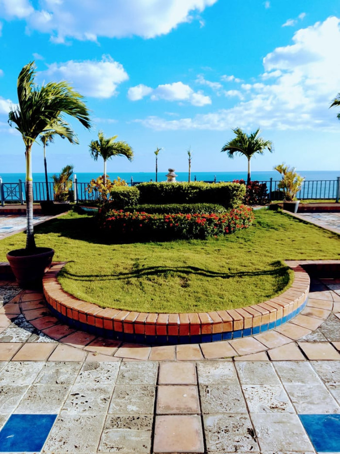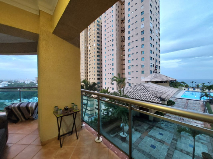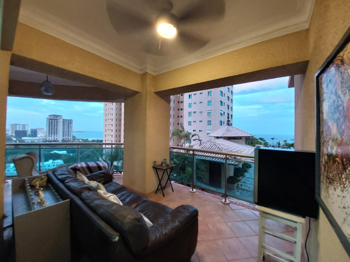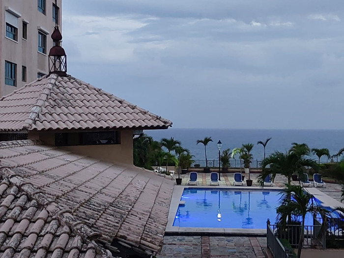 Amplio balcon con vista al mar y a la piscina